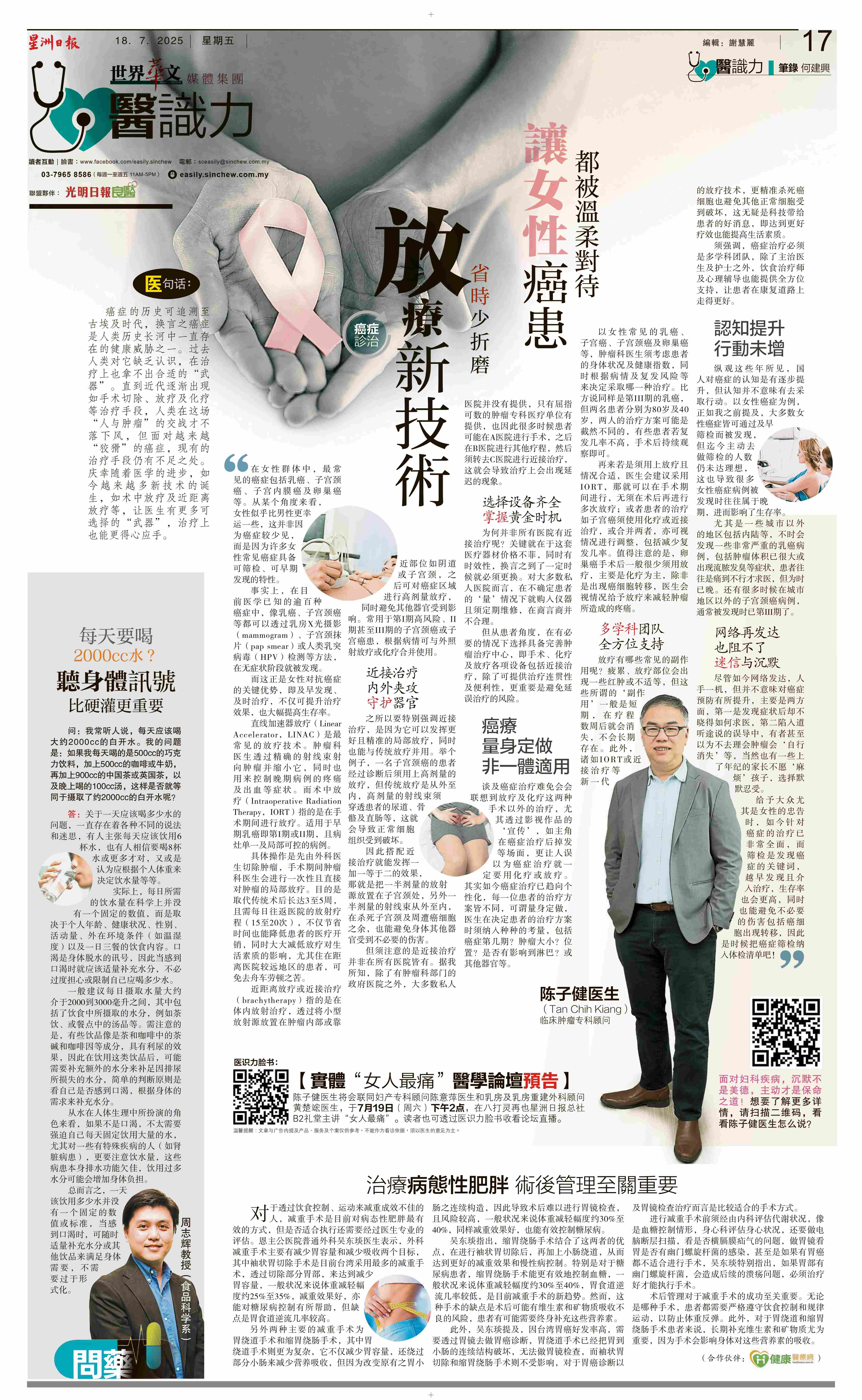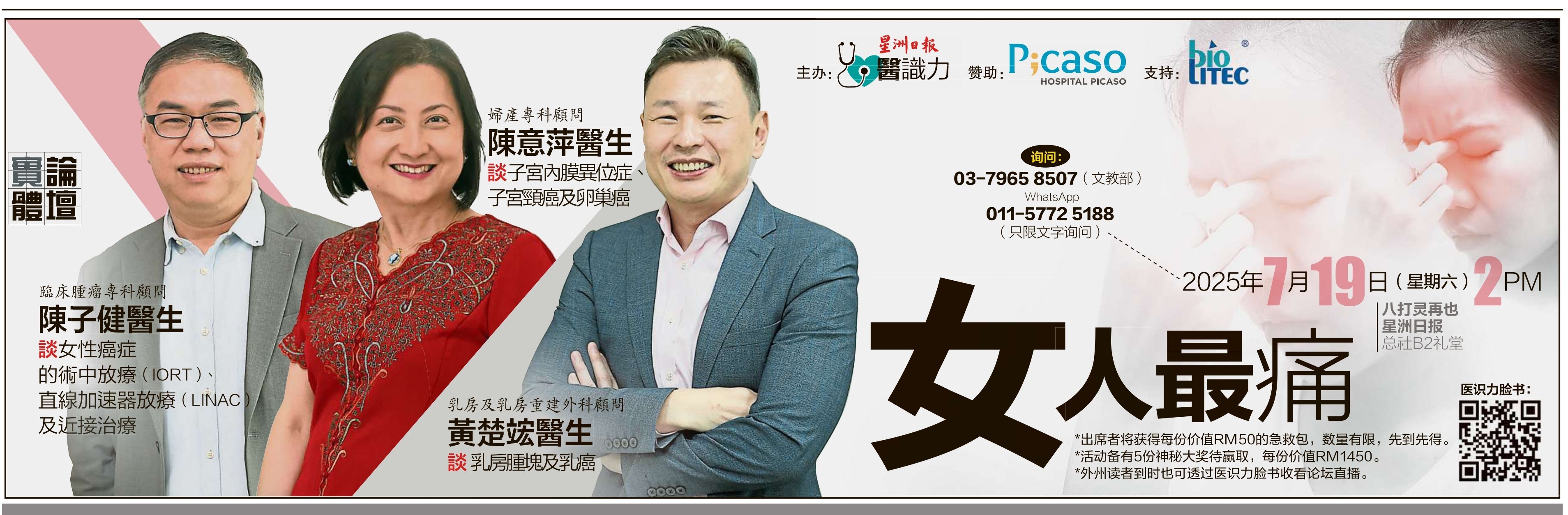 陈子健医生将会联同妇产专科顾问陈意萍医生和乳房及乳房重建外科顾问黄楚竤医生,于7月19日(周六)下午2点,在八打灵再也星洲日报总社B2礼堂主讲“女人最痛”。读者也可透过医识力脸书(www.facebook.com/easily.sinchew/)收看论坛直播。