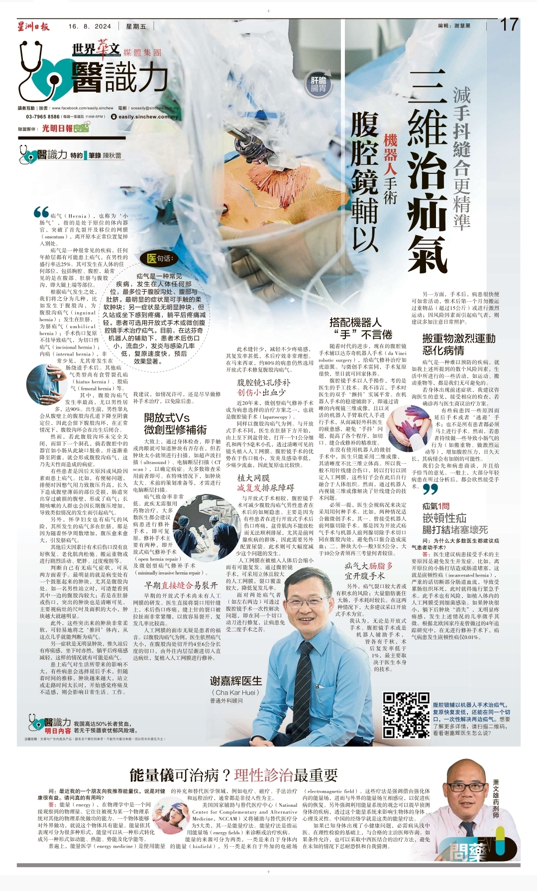 疝气是一种常见疾病,发生在人体任何部位,最多位于腹股沟处、腹部与肚脐。最明显的症状是可手触的柔软肿块;另一症状是无明显肿块,但久站或坐下感到疼痛,躺平后疼痛减轻。患者可选用开放式手术或微创腹腔镜手术治疗疝气。目前,在达芬奇机器人的辅助下,患者术后伤口小,流血少,发炎与感染几率低,复原速度快,预后效果显著。