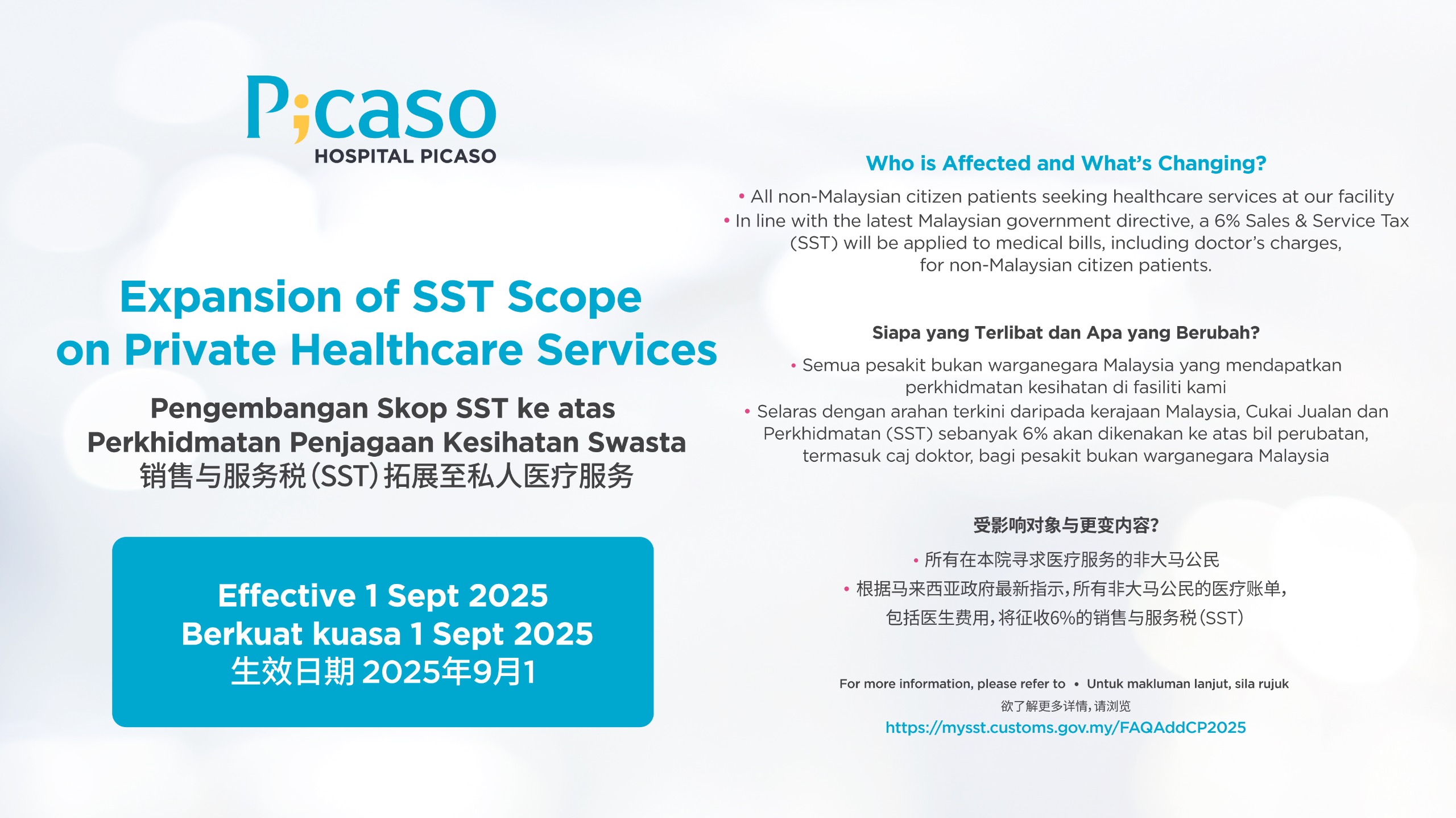 - 根据马来西亚政府最新指示,所有非马来西亚籍患者的医疗账单(包括医生费用)将征收 6% 的销售与服务税(SST)。更多信息请参阅马来西亚皇家关税局官方网站。
