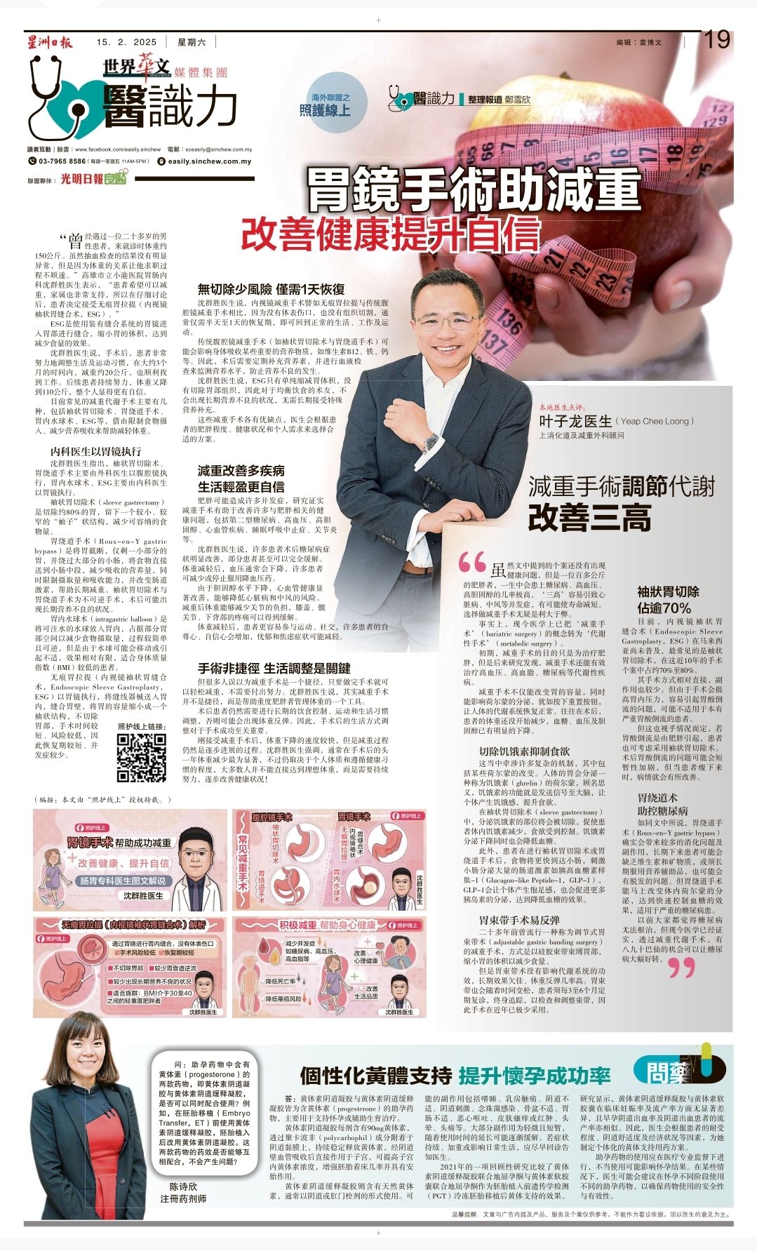 以前大家都觉得糖尿病无法根治,但现今医学已经证实,透过减重代谢手术,有八九十巴仙的机会可以让糖尿病大幅好转。”