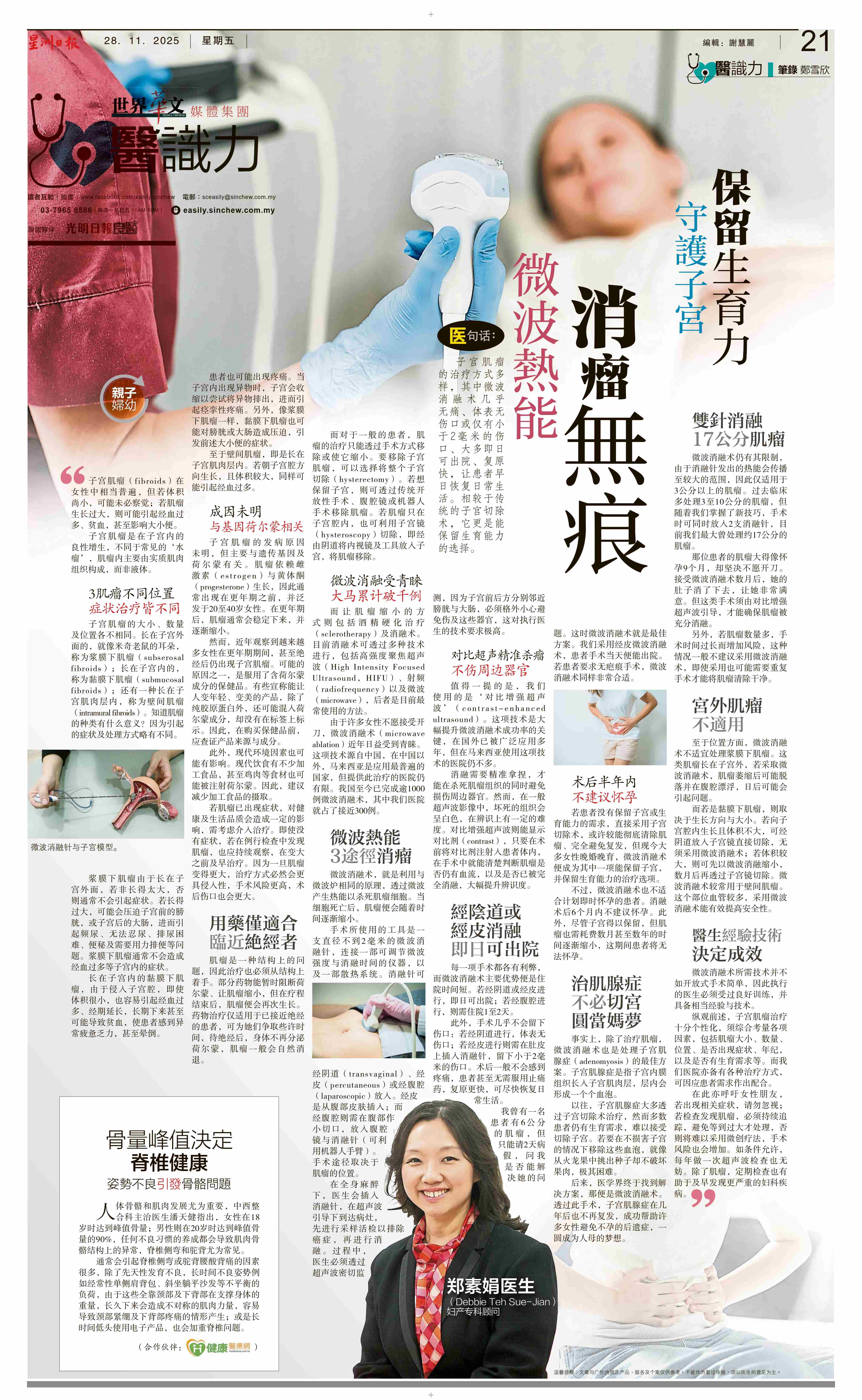 由于许多女性不愿接受开刀,微波消融术(microwave ablation)近年日益受到青睐。这项技术源自中国,在中国以外,马来西亚是应用最普遍的国家,但提供此治疗的医院仍有限。我国至今已完成逾1000例微波消融术,其中我们医院就占了接近300例。