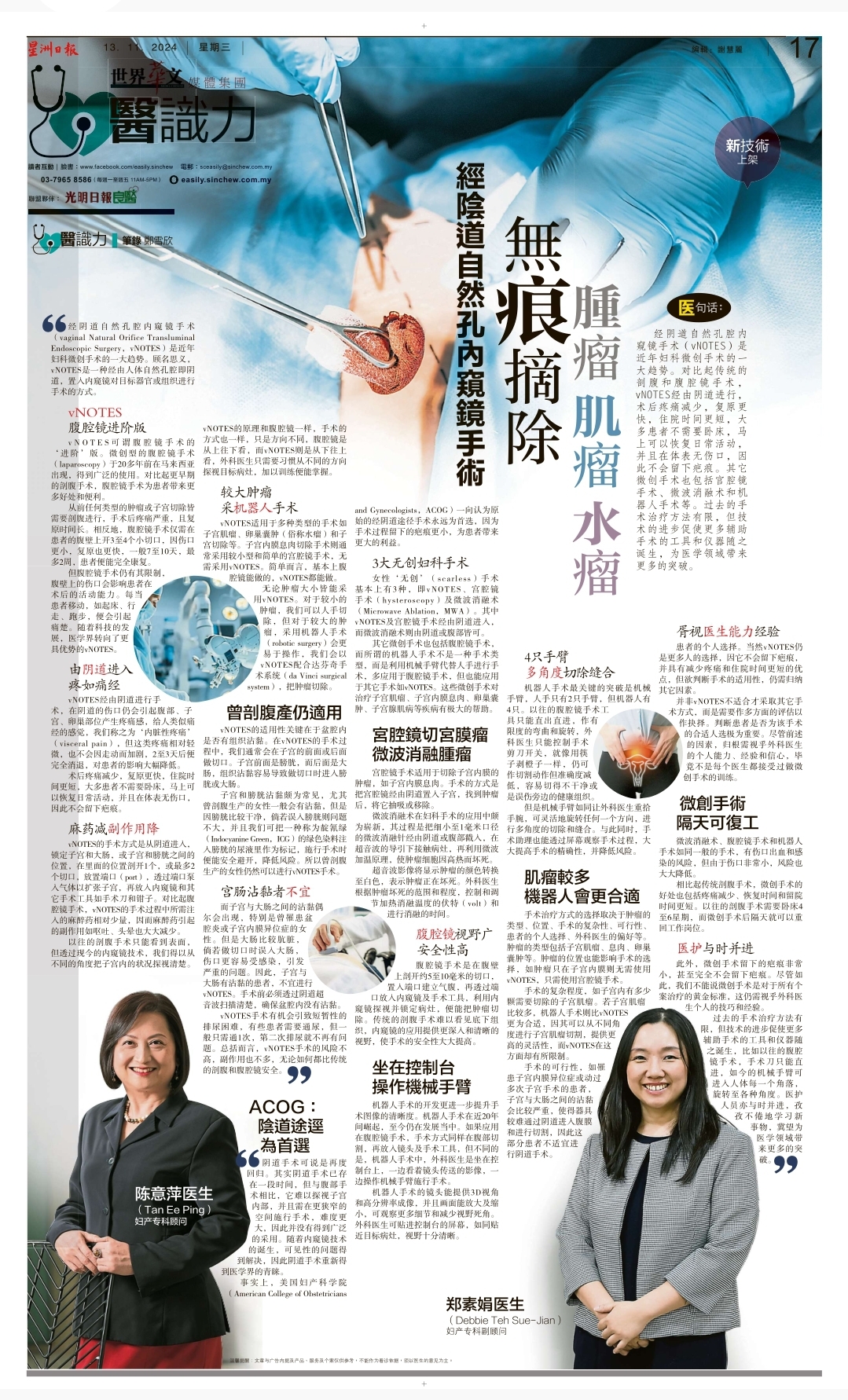 “阴道手术可说是再度回归。其实阴道手术已存在一段时间,但与腹部手术相比,它难以探视子宫内部,并且需在更狭窄的空间施行手术,难度更大,因此并没有得到广泛的采用。随着内窥镜技术的诞生,可见性的问题得到解决,因此阴道手术重新得到医学界的青睐。