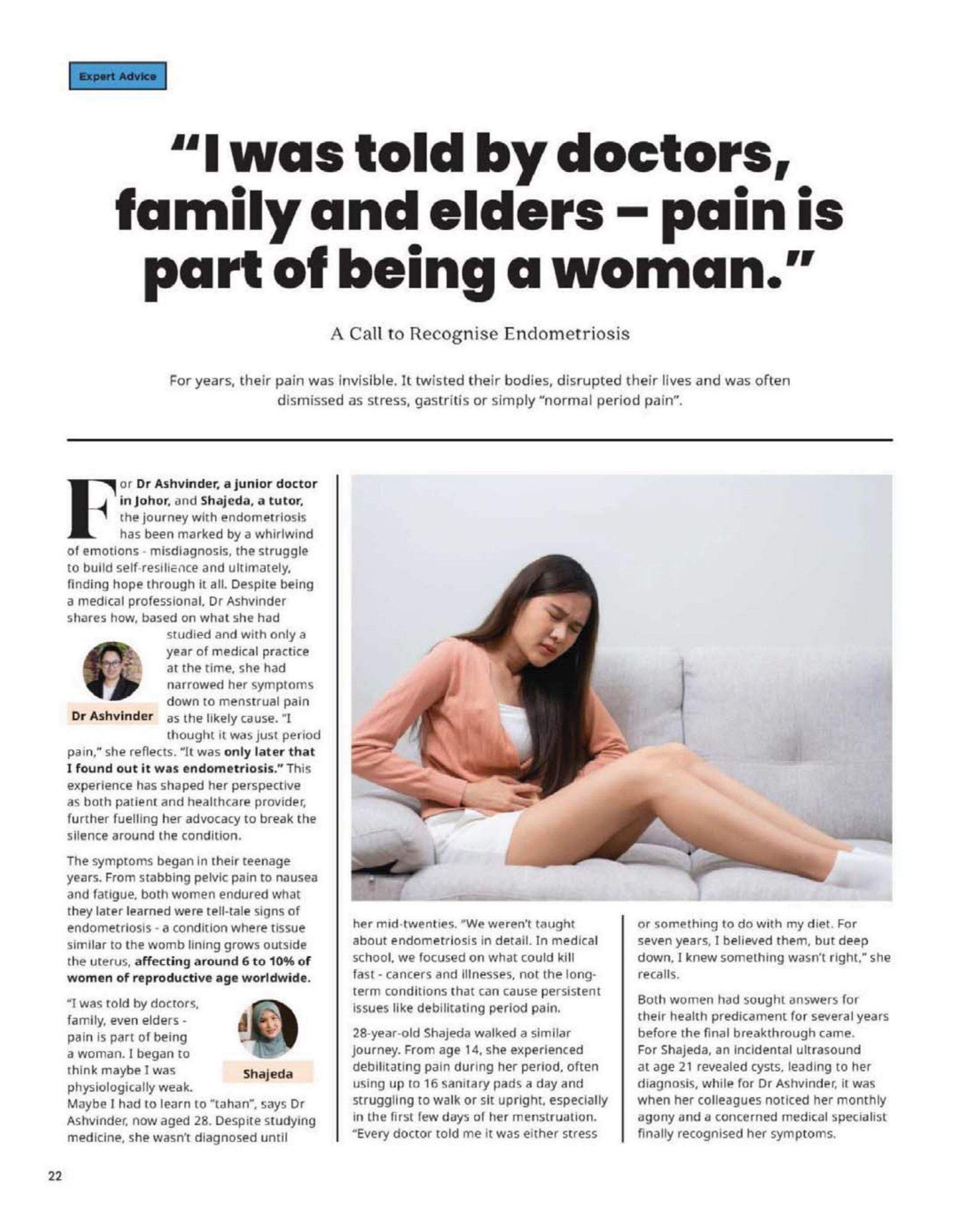 “I was told by doctors, family, even elders – pain is part of being a woman. I began to think maybe I was physiologically weak. Maybe I had to learn to “tahan”, says Dr Ashvinder, now aged 28. Despite studying medicine, she wasn’t diagnosed until her mid-twenties. “We weren’t taught about endometriosis in detail. In medical school, we focused on what could kill fast – cancers and illnesses – not the long-term conditions that can cause persistent issues like debilitating period pain.