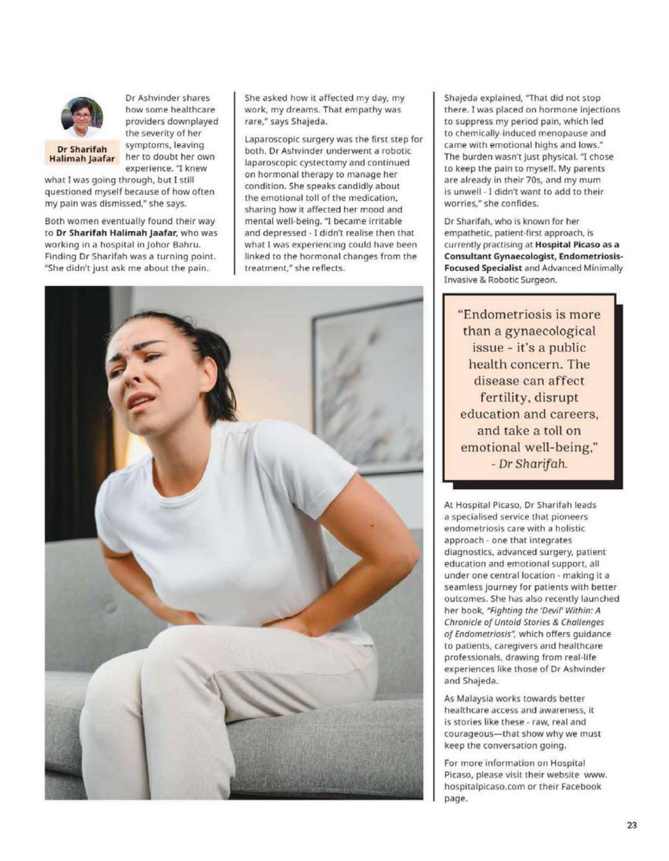 At Hospital Picaso, Dr Sharifah leads a specialised service that pioneers endometriosis care with a holistic approach – one that integrates diagnostics, advanced surgery, patient education and emotional support, all under one central location – making it a seamless journey for patients with better outcomes. She has also recently launched her book, “Fighting the ‘Devil’ Within: A Chronicle of Untold Stories & Challenges of Endometriosis”, which offers guidance to patients, caregivers and healthcare professionals, drawing from real-life experiences like those of Dr Ashvinder and Shajeda.