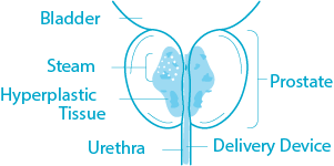 A special instrument is inserted into the urethra. Once inside the urethra, the tip of the instrument is positioned next to the prostate. Steam is then released from the tip and into the hyperplastic prostate tissue, shrinking the tissue while widening the urethra, allowing urine to flow freely
